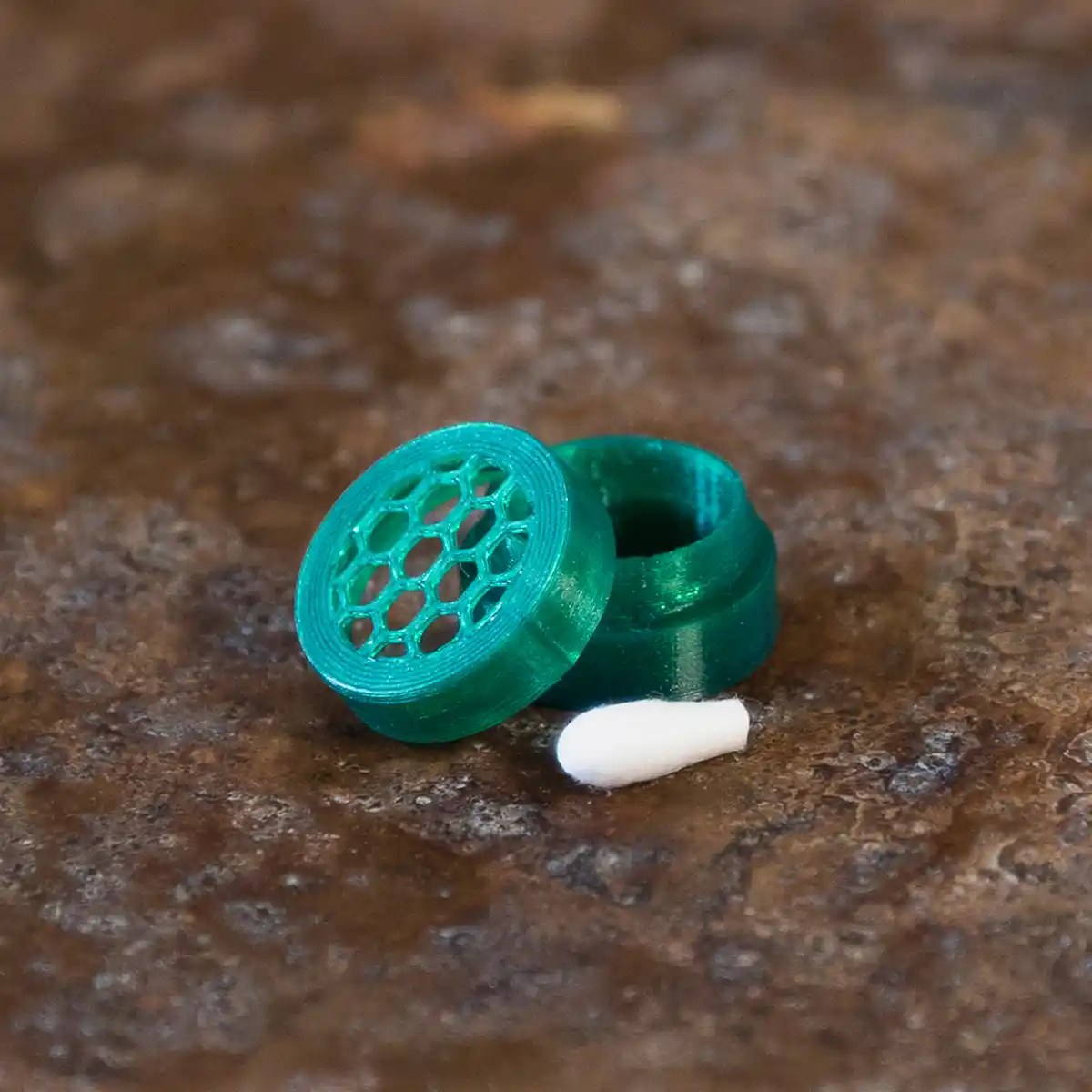 Denna lilla runda dofthållare är en dosa med skruvlock och den är gjord av PLA som är ett fossilfritt, plantbaserat material. I dosan placerar du din preparerade doftbärare, i HONEY rekommenderar vi att du använder tops. Du kan gömma HONEY riktigt klurigt både i inomhussök, utomhussök och på fordon. Dofthållaren har ett honeycomb-mönster i botten, som släpper ut doftmolekylerna. Varken nosen eller omgivningen kommer i kontakt med doftbäraren.