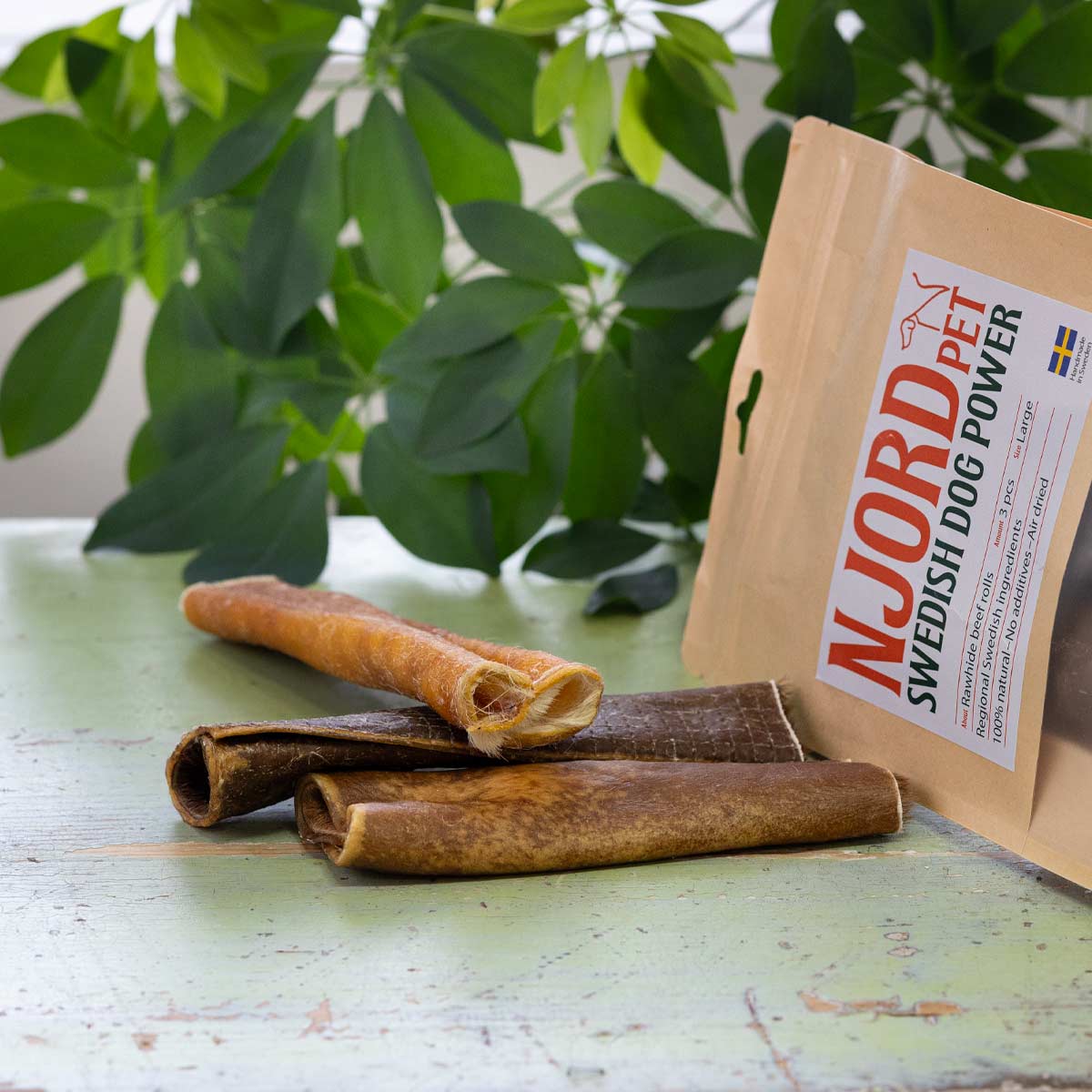 Fin torkad tjurmuskel, närproducerad med svenska råvaror och helt utan tillsatser. Både naturligt och näringsrikt. De flesta hundar älskar att tjurmuskel som tugg, den är oerhört populär hos oss. Dessutom är den producerad med solenergi, hela ladugårdens tak är fyllt av solceller. Så hållbar produktion. Solel och vatten är vad som går åt vid produktionen.