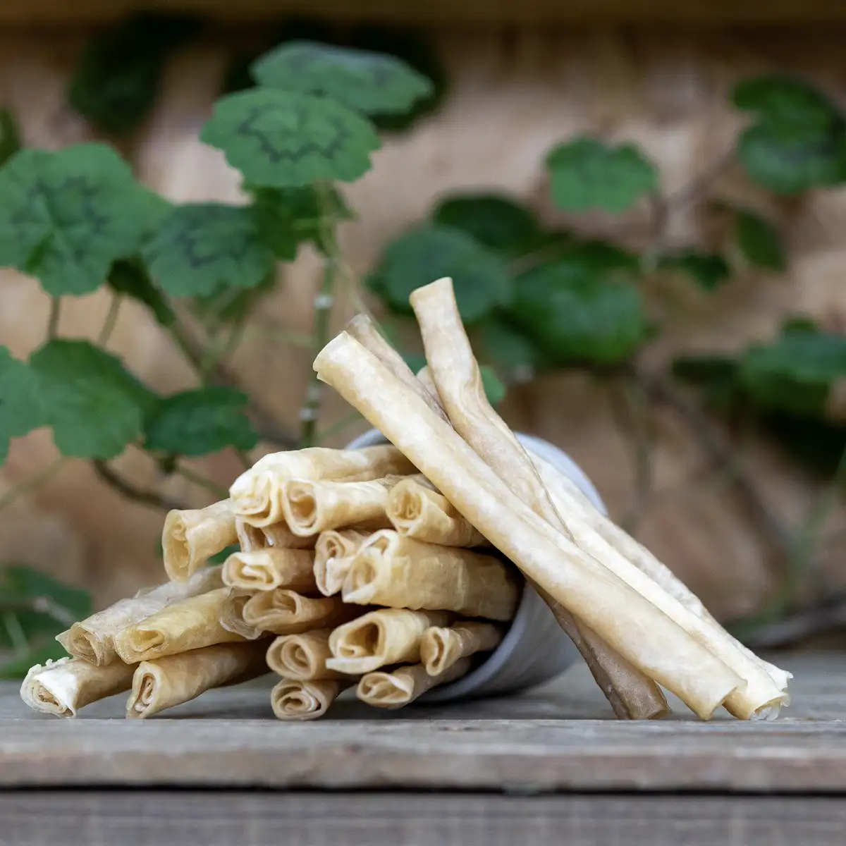 Rensticka till små hundar och valpar. Ett fint naturligt tuggben av rullad renhud som torkats helt utan tillsatser, enligt traditionella metoder. Passar även hundar med känslig mage. Renhuden kommer från renar här i Norden. En ren naturprodukt. Mycket hållbart.